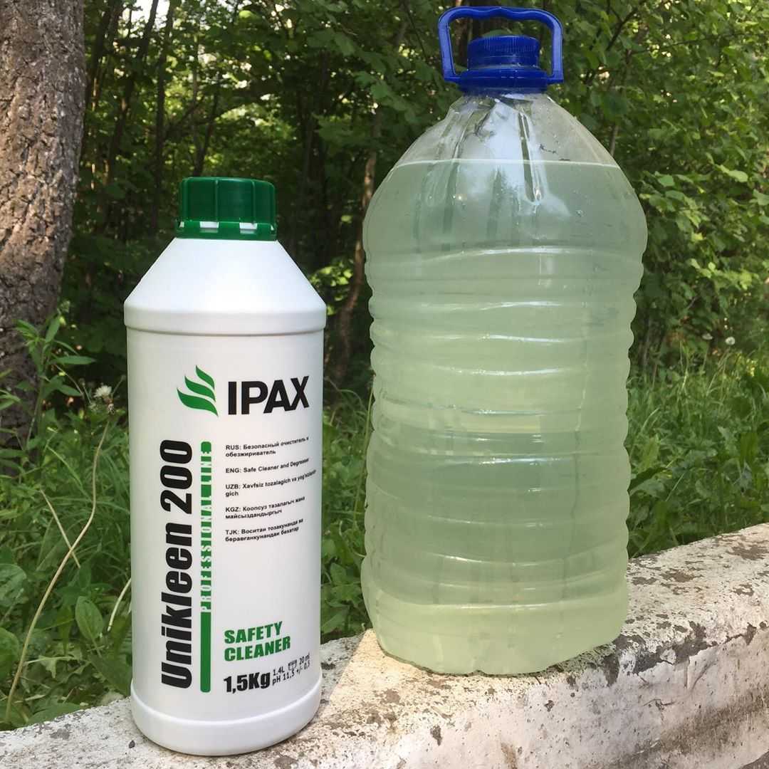 Большим количеством проб и ошибок мы выяснили, что в таком случае лучше всего работает смесь воды и автомобильного шампуня для бесконтактной мойки. Шампуней так же было испробовано не мало, лично мы выделили шампунь фирмы DECO (артикул 010863). Тара 5кг стоит около 1000 рублей. Оптимальная пропорция – 100 грамм на 4 литра воды.