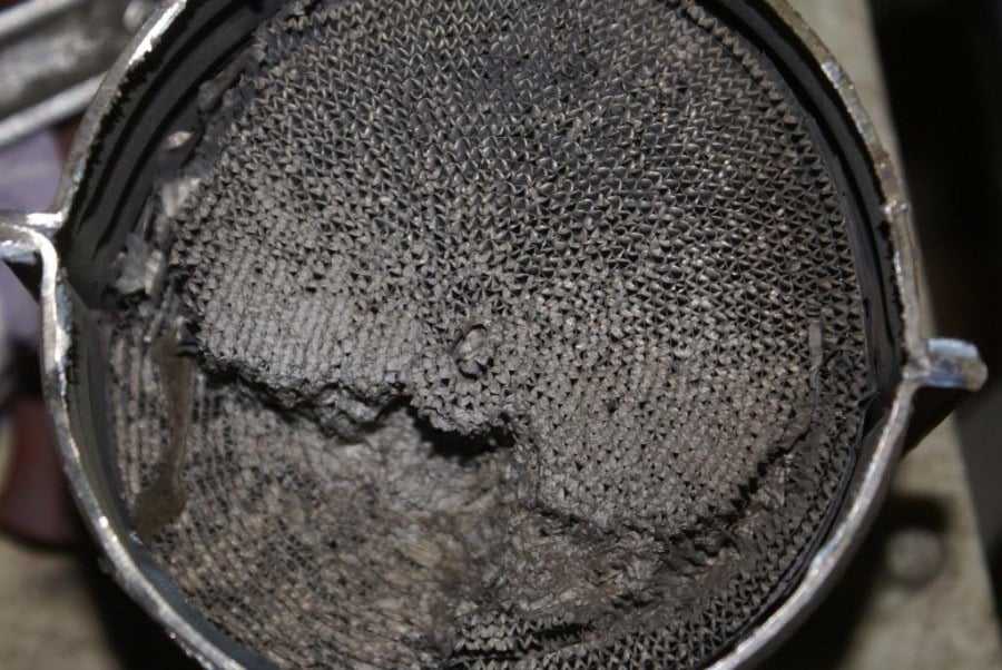 - Состояние двигателя автомобиля: ЦПГ, ГБЦ и системы зажигания. Масло попадает в выпуск, забивает соты, а при пропуске или поздним зажигании приводит к воспламенению топлива в выпускной системе и сплавлению сот.