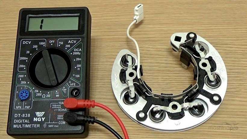 Далее положительный щуп подсоедините к болтам крепления моста, а отрицательный к корпусу генератора. В этом случае тестер также должен выдавать бесконечность.