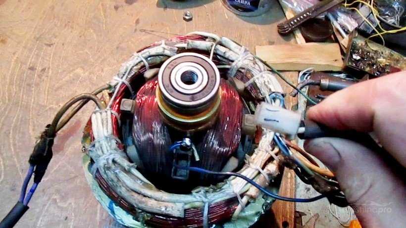Обмотка якоря не должна явно пахнуть гарью. Цвет обмотки должен быть однородным, не иметь повреждений и разрывов. Для проверки обмотки якоря на обрыв понадобится мультиметр. Выставьте режим работы на прозвонку или замер сопротивления и подсоедините щупы к щёточным кольцам. Сопротивление обмотки должно быть в пределах 3−5 Ом. Затем один щуп оставьте на кольце, другой соедините с корпусом. Дисплей мультиметра должен показать бесконечность.