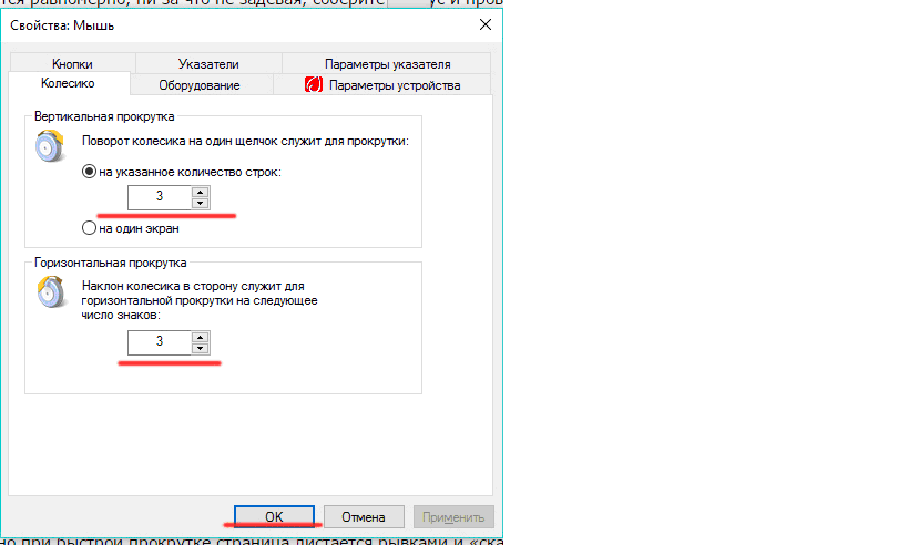 - В настройках мыши нужно выбрать вкладку «Колесико», после чего откроется шкала, где бегунок нужно довести до максимума и нажать кнопку «ОК» или «Применить».