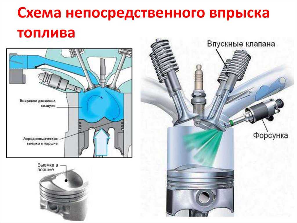 Как видно, система топливоподачи MPI гораздо проще во всех отношениях. Но, это далеко не все. В двигателях с прямой подачей топлива на их производительность влияет распределение воздуха внутри них и количество впрыснутого топлива в цилиндры. По этой причине поршневая часть в агрегатах с системой прямого впрыска имеет сложную профилированную конструкцию.