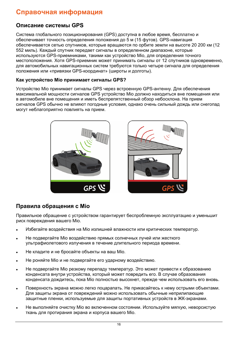 Устройство Mio принимает сигналы GPS через встроенную GPS-антенну. Для обеспечения максимальной мощности сигналов GPS устройство Mio должно находиться вне помещения или в автомобиле вне помещения и иметь беспрепятственный обзор небосклона. На прием сигналов GPS обычно не влияют погодные условия, однако очень сильный дождь или снегопад могут неблагоприятно повлиять на прием.