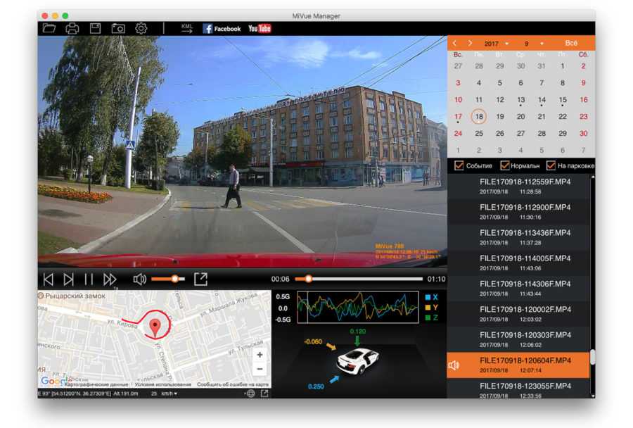 Если же вы захотите при просмотре отснятого материала также фиксировать и местонахождение автомобиля (не забываем, что регистратор постоянно записывает и координаты по GPS/GLONASS), то для этого нужно воспользоваться фирменной программой MiVue Manager, но о ней мы уже говорили в нашем обзоре Mio MiVue 678.