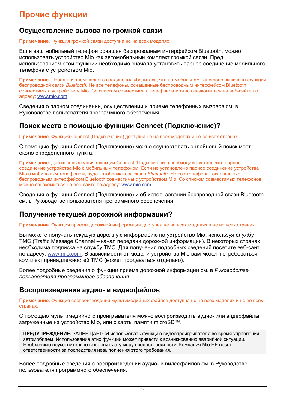 Примечание. Перед началом парного соединения убедитесь, что на мобильном телефоне включена функция беспроводной связи Bluetooth. Не все телефоны, оснащенные беспроводным интерфейсом Bluetooth совместимы с устройством Mio. Со списком совместимых телефонов можно ознакомиться на веб-сайте по адресу: