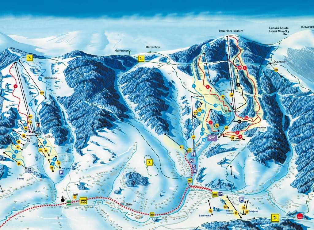 Начнем наш обзор из лучшего чешского горнолыжного курорта Пец под Снежкой, расположенного в восточном секторе национального парка Крконоше на южном склоне горы Снежка — главной вершины хребта (высота 1602 м). Расстояние в 170 км от Праги легко преодолевается за 4 часа. На территории курорта разбиты несколько типов лыжных трасс для опытных спортсменов и новичков. Всего в наличии 8 красных, 3 синих и 1 черный спуск. Все трассы расположены компактно и сходятся к долине реки Упа. Подъем к каждой оборудован канатной дорогой. Пропуск на фуникулер обойдется в 450 крон в день и 1800 крон на неделю. Для приема гостей предусмотрено свыше 100 отелей разного класса. Преобладают 3-х и 4-х звездочные гостиницы. Цены на размещение для 2 человек составляют примерно 34-40 евро в сутки в начале сезона катания. Он стартует в начале ноября и длится до конца апреля.