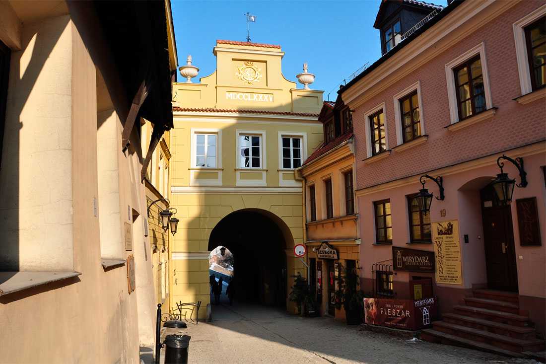 Через главные городские ворота бледно-желтого цвета проходит дорога от городского рынка до Люблинского замка. Когда-то они обозначали вход в Еврейский квартал Люблина, а в последние десятилетия главные ворота являются центром культурного наследия польских евреев.