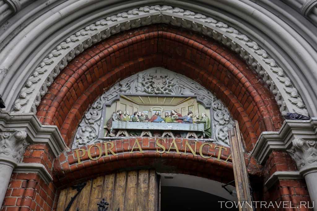 Главный вход в костел украшен барельефом, на котором изображен момент, когда Иисус указал своим ученикам на будущего предателя – Иуду.