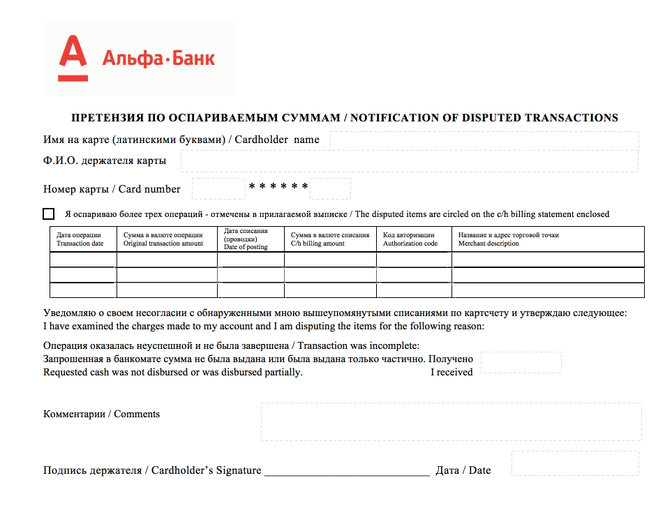 Еще раз отметим, что можно заявление заполнять по образцу любого банка, к примеру, у Альфа-банка оно намного проще, необходимо только прописать личные сведения, операцию, первые и крайние четыре цифры карточки.