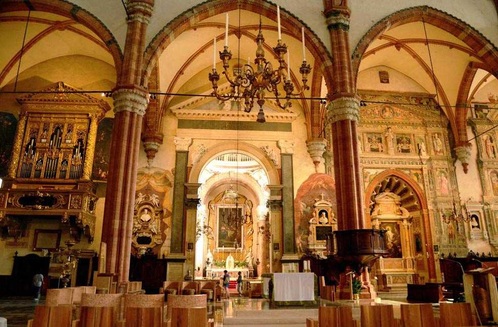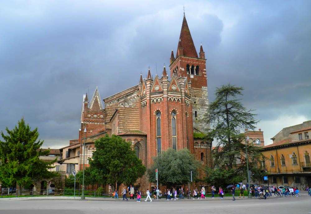 Кафедральный, то есть главный католический собор (Duomodi Verona) строился начиная с 12 до 15 вв. Относится к готическому стилю, за исключением раннего портала с витыми колоннами, которые опираются на фигуры грифонов. Впечатляет готический интерьер с традиционными крестовыми сводами, расписанными золотыми звездами. Одна из фресок выполнена Тицианом – «Вознесение девы Марии». Очень красив внутренний двор собора с двухъярусной аркадой сдвоенных изящных колонн. Здесь расположено церковное хранилище древних текстов. К собору пристыкована Сан Джованни ин Фонте – церковь Иоанна Крестителя у купели, сооруженная в 1123 г. Она служила местом крещения. Стенки восьмигранной, вырезанной из цельного мрамора купели покрыты резными изображениями евангельских историй. Небольшая церковь Санта Мария Аттика (7-12 века) с колокольней впечатляет необычной архитектурой. Но еще интереснее расположенные перед ней на площади так называемые арки Скалигеров. Это готические надгробия династии правителей Вероны в 12-14 веках. Удивительные сооружения в виде открытых шатров с висячими гробницами или гробницами под арками, считаются выдающимися образцами веронской скульптуры.