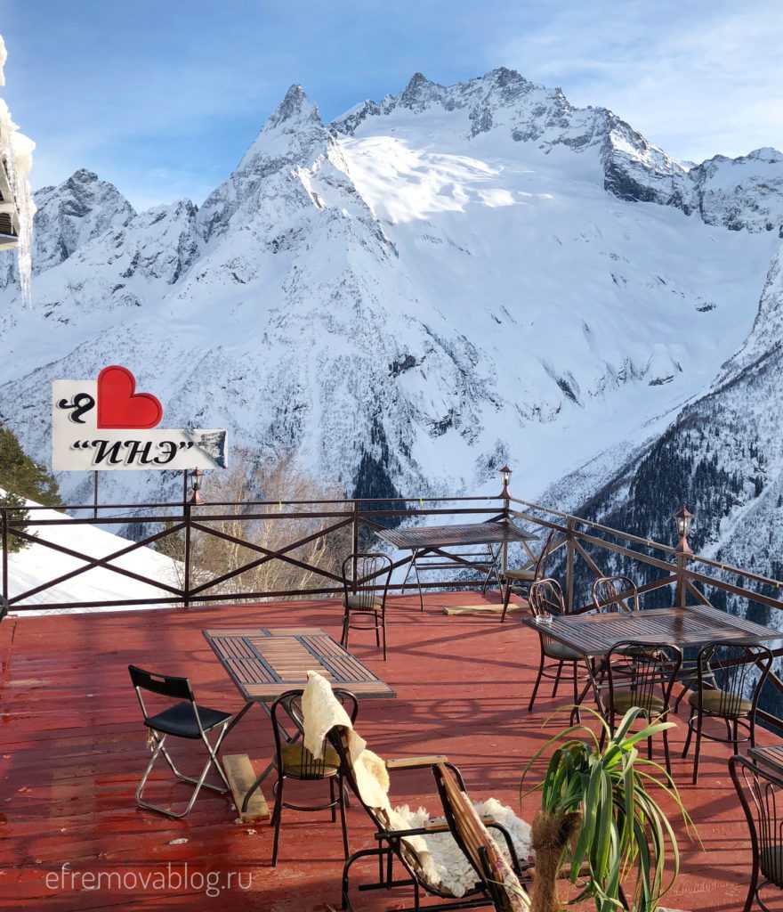 Самое лучшее кафе на третьем уровне — «Пик Инэ». На 4-м уровне: «Седьмое небо», «Домбайский вальс», «У Тотти»,«Эдельвейс». На 5-м уровне — «3012».