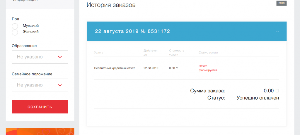 Шаг 3. Готово. Напомню, что это бесплатно — пусть запись о покупке не пугает. Теперь перейдите в раздел “История заказов” или “Мои услуги”. Ждите, пока сформируют отчет.