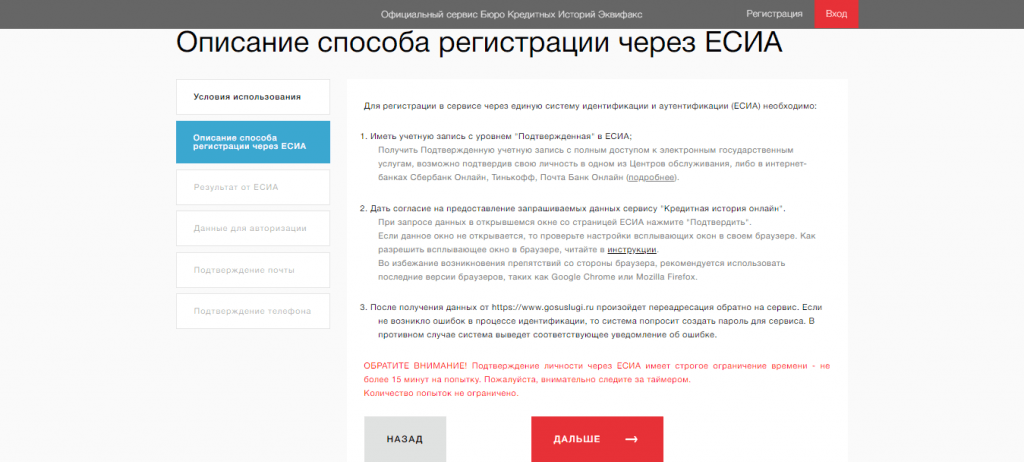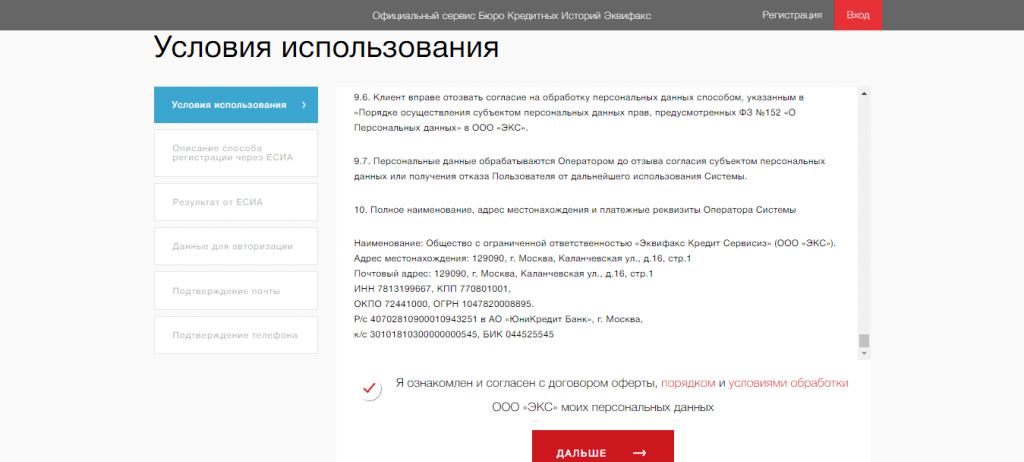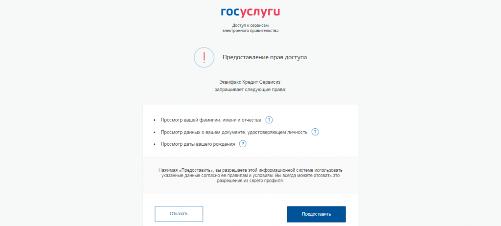 Шаг 5. Кликните “Дальше”. Система перекинет вас на сайт Госуслуг для входа. После авторизации появится запрос на подтверждение предоставления личных данных БКИ “Эквифакс”. Кликните “Предоставить”.
