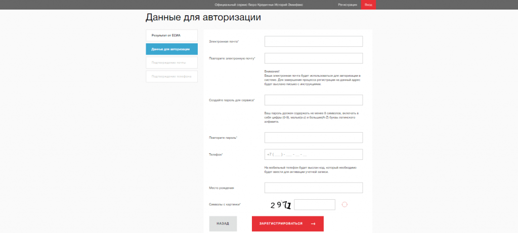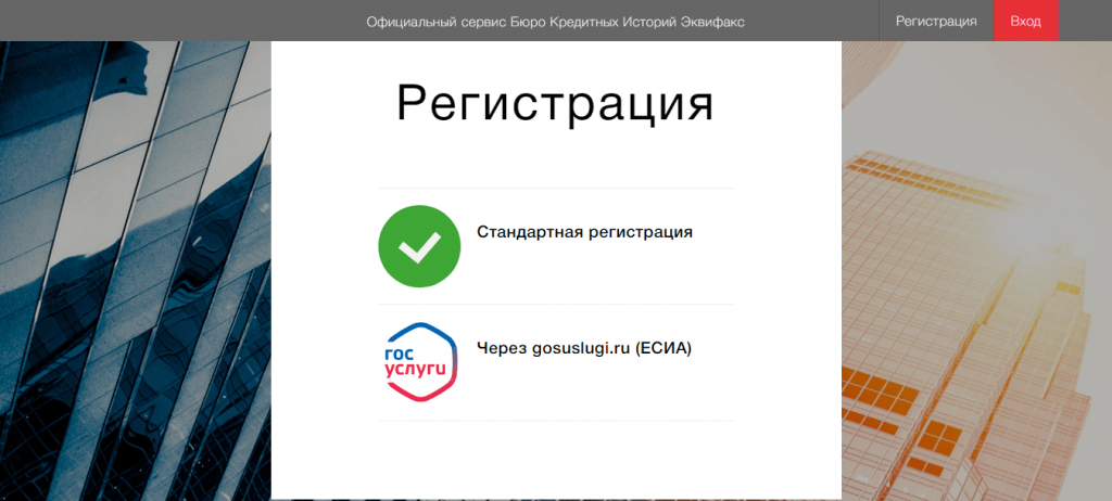 Шаг 2. Кликните на красный прямоугольник “Кредитная история бесплатно”. На следующей странице система предложит пройти регистрацию: стандартно или через Госуслуги.