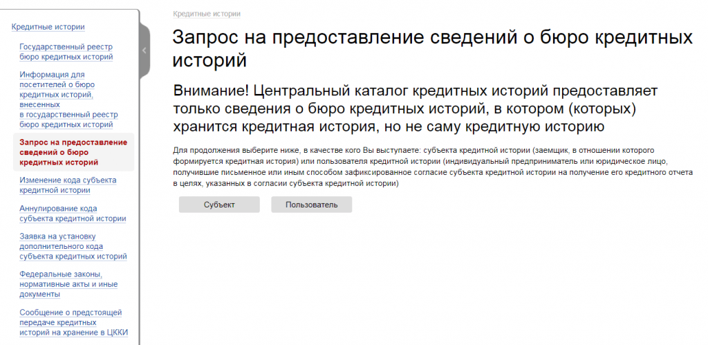 Шаг 2. Кликните на кнопку “субъект” — означает, что вы делаете запрос как физлицо на получение сведений о своих БКИ.