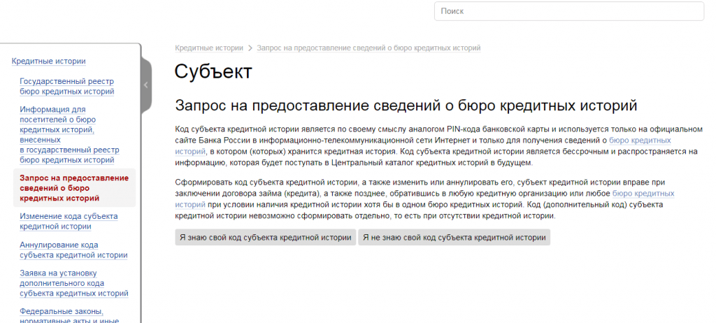 Далее у вас спросят, знаете ли код субъекта кредитной истории. Код субъекта — это своеобразный ПИН-код, необходимый для одной единственной цели: для получения доступа на сайте ЦБ к сведениям о кредитных бюро с вашей историей.