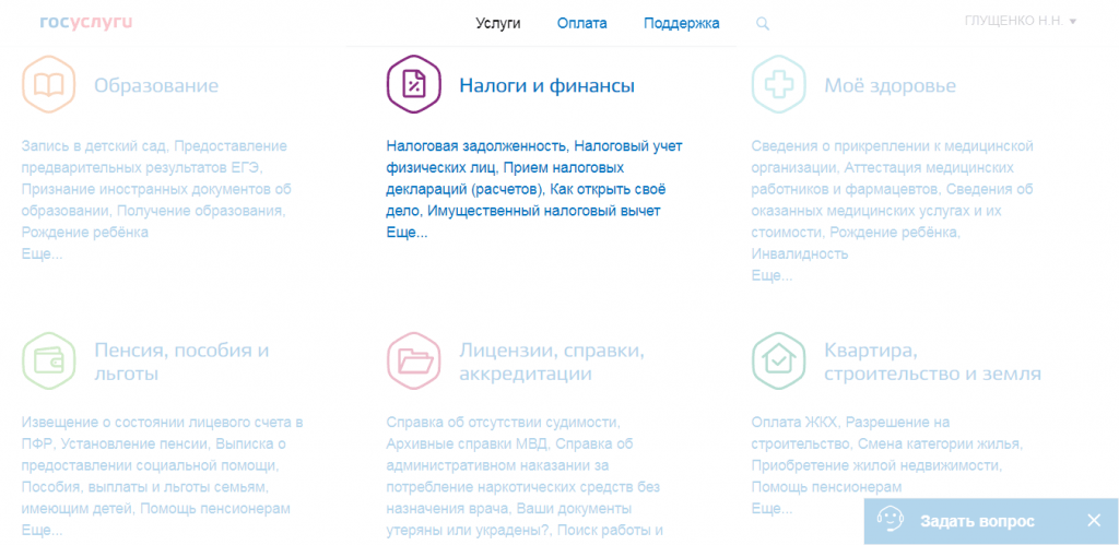 Шаг 2. Кликните на раздел с услугами, далее — Налоги и финансы.