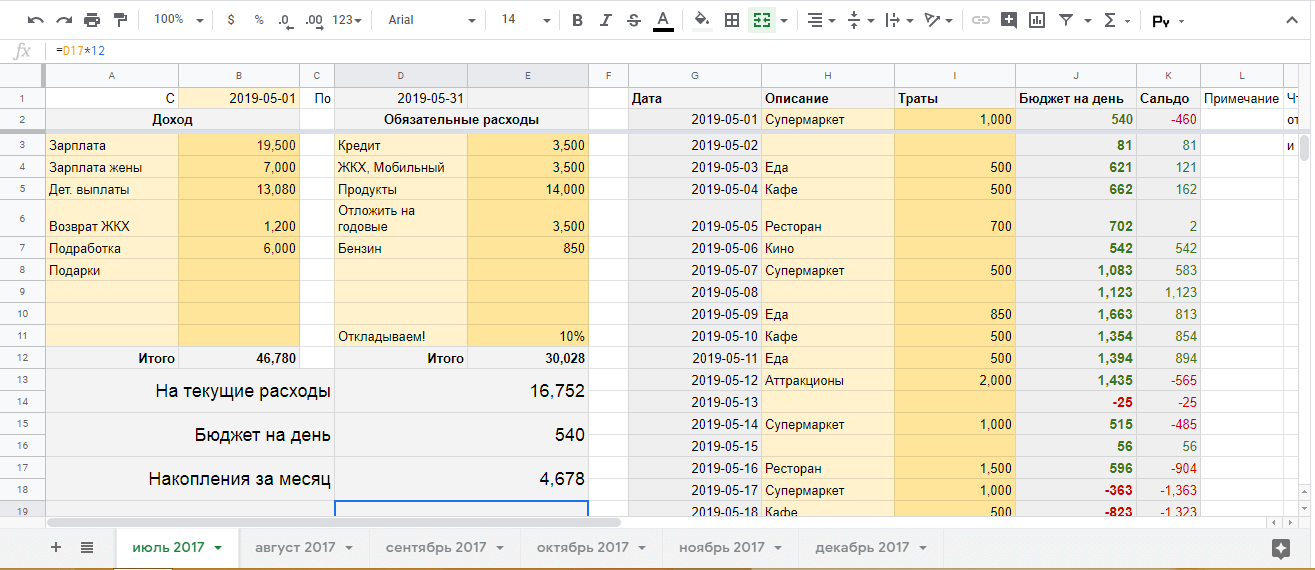 Потом я скопировал этот лист под названием «Июнь 19 основа», чтобы при планировании июня у меня уже был стартовый лист. Также я скопировал этот лист под названием «Май 19» — это будет рабочий лист для учета исполнения бюджета, о чем расскажу ниже.
