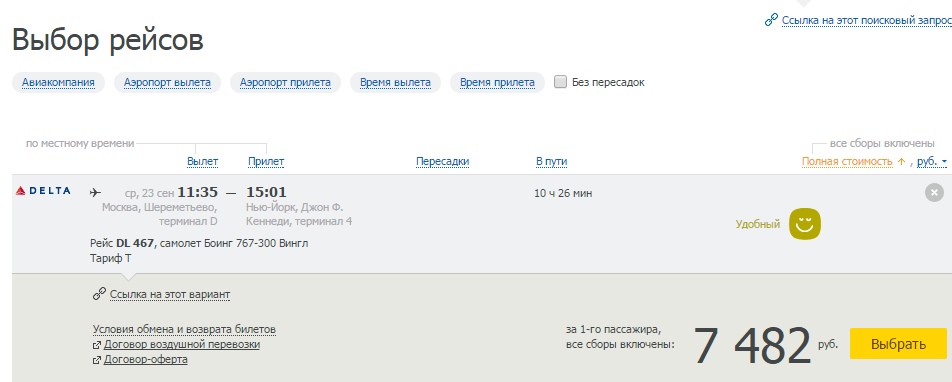 Найденный авиаперелет на поисковике: Москва — Нью-Йорк за 7482 руб.