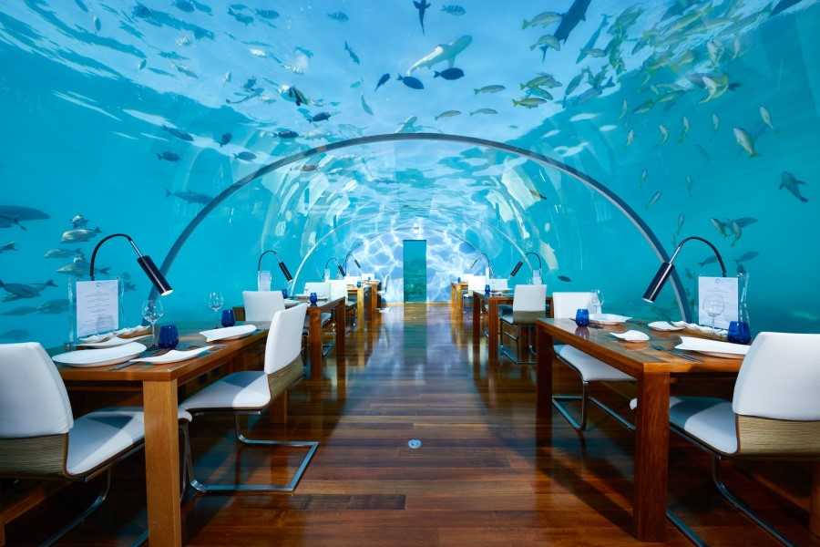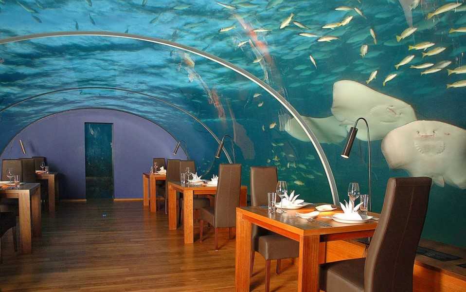 Не только скаты любят вкусно поесть на глубине! Ресторан Ithaa Underwater Restaurant находится на 5 метров ниже уровня океана рядом с коралловым рифом и островом, который принадлежит курорту Conrad Maldives Rangali Island. Сквозь его панорамные окна любуются не островными пейзажами, а подводными красотами. Рифы, экзотические моллюски и стаи тропических рыб — вот такие виды. И окна здесь — это не только прозрачные стены, а еще и прозрачный купольный потолок.