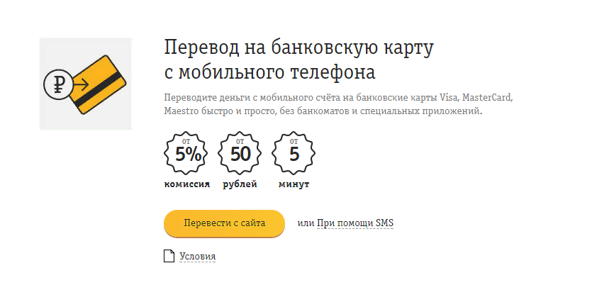 - пролистав страничку ниже, можно обнаружить раздел «Перевод с телефона на банковскую карту»;
