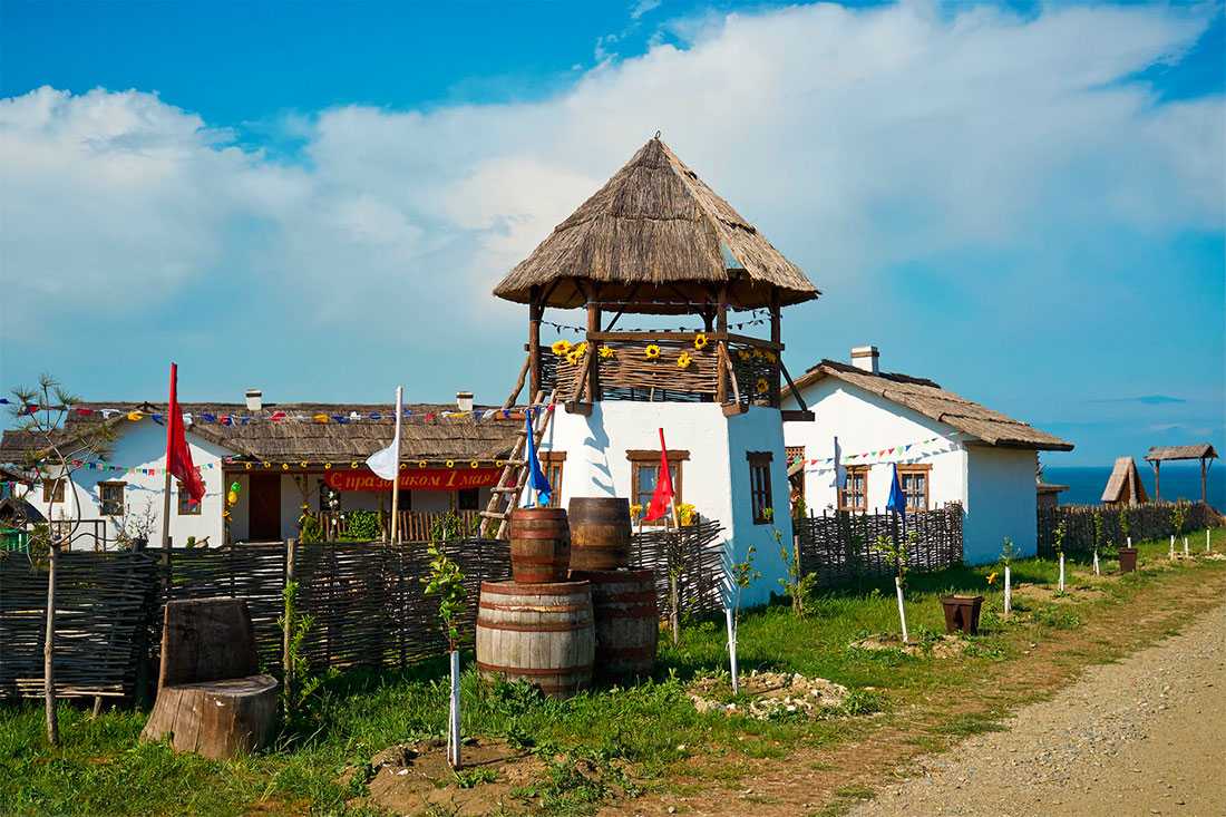 На нескольких улицах размещены тематические постройки. Есть здесь рыбацкое и оружейное подворье, мастерские сапожника, ткача и гончара, жилье атамана и хаты рядовых казаков, школа, церковь и мельница.