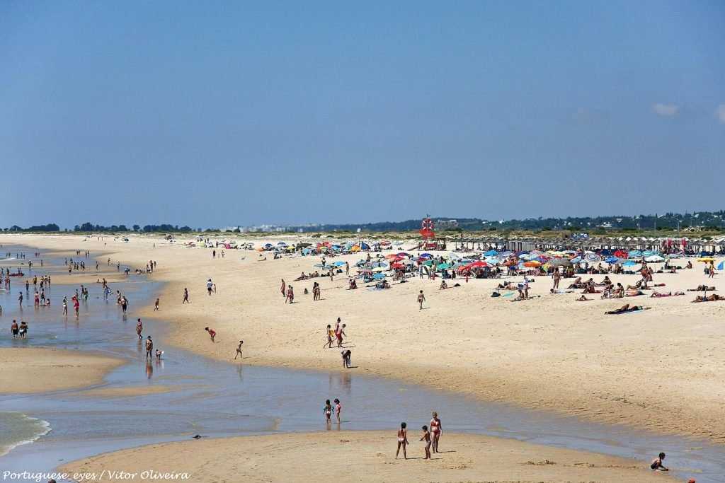 Отмеченный голубым флагом чистоты, Praia de Faro на одноименном острове тянется на 7 километров. Он связан с побережьем транспортным мостом. Пляж располагает отличной инфраструктурой – по сути это отдельный туристический район с отелями, ресторанами, магазинами. Здесь комфортный пологий вход в поре, но часто бывают сильные волны. Кроме купания на Прайя де Фару популярны водные виды спорта.