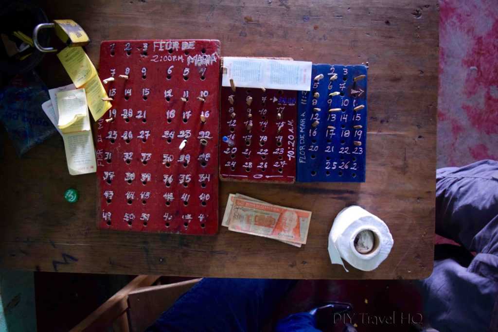 Purchase a ticket at the Transporte Flor de Maria office directly behind the bus, and mark your seats with pegs in the wooden board.