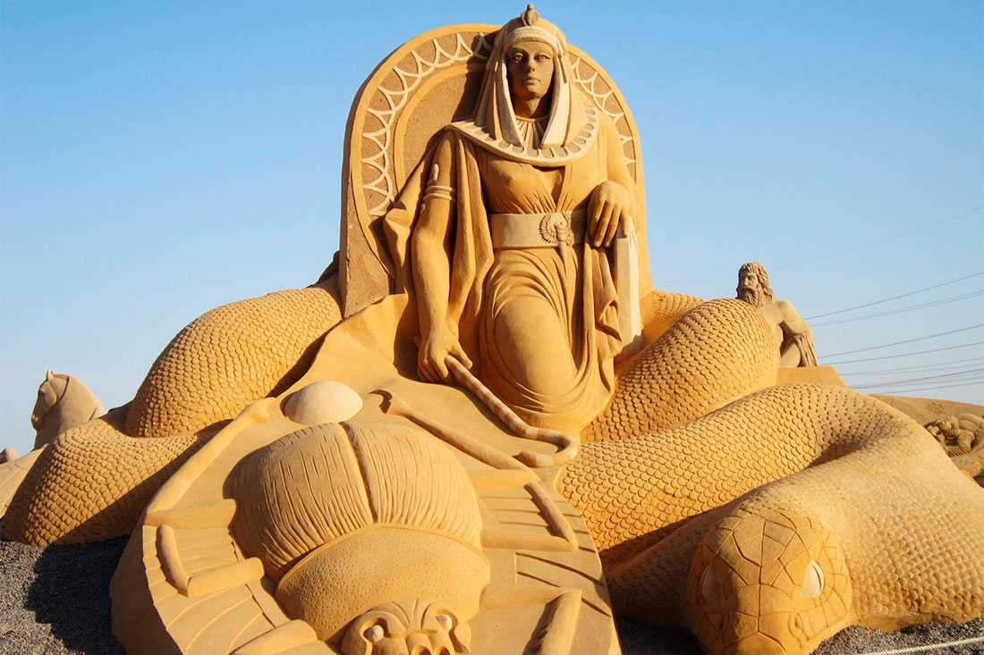 Огромные изваяния из песка в четыре раза выше человеческого роста в течение 7 месяцев создавались художниками-скульпторами из 17 стран мира. Выставка скульптур поделена на две части. В первой вы увидите изваяния исторических личностей, а также известных богов, богинь и героев легенд.