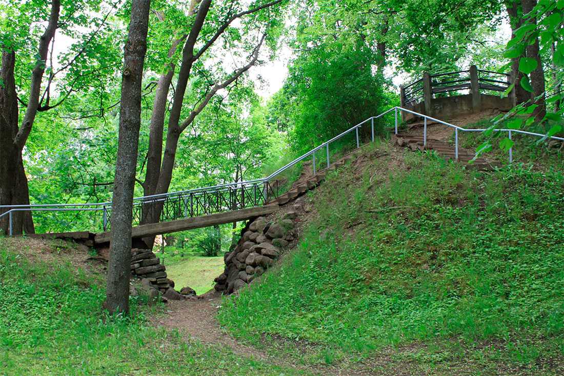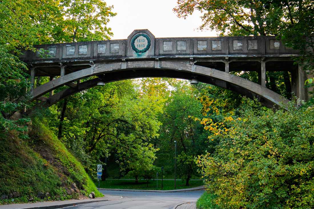 Строительство красивого пешеходного мостика над дорогой было приурочено к 300-летию правления династии Романовых. В отделке воздана дань императору Александру I: он царским указом повелел открыть Дерптский университет (современный Тартуский).
