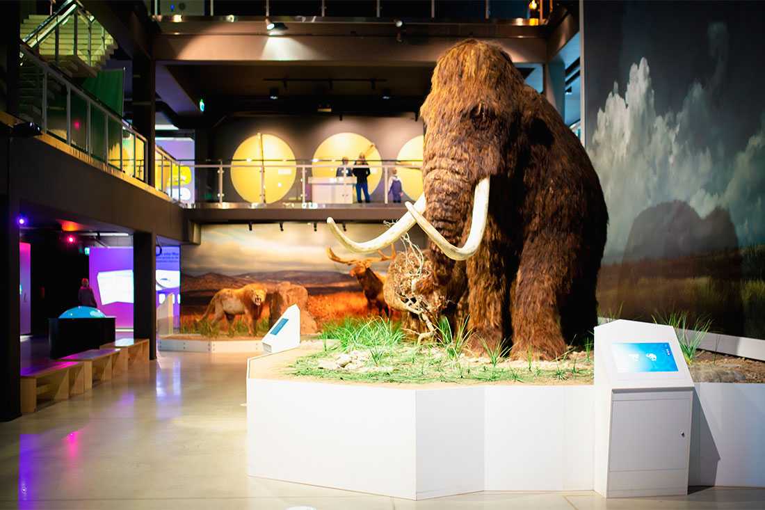 На первом этаже гости познакомятся с фауной ледникового периода, представленной в виде полноразмерных чучел мамонта, древнего оленя и пещерного льва. Здесь же можно больше узнать о быте доисторических людей.