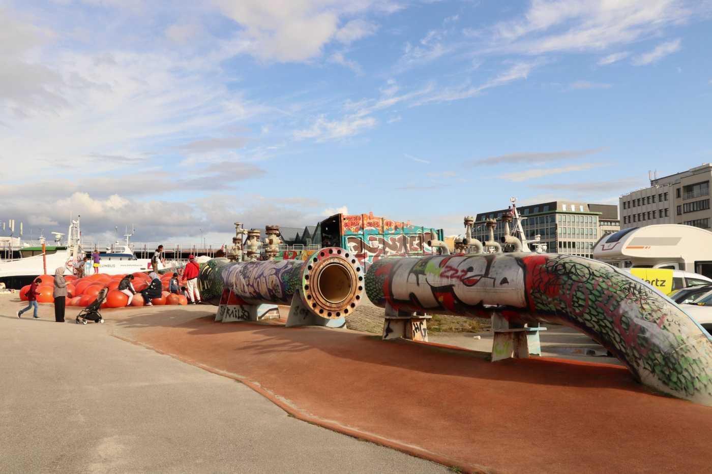 У музея на причале была создана детская площадка из частей, напоминающих части нефтяных платформ и предприятий по нефтепереработке.