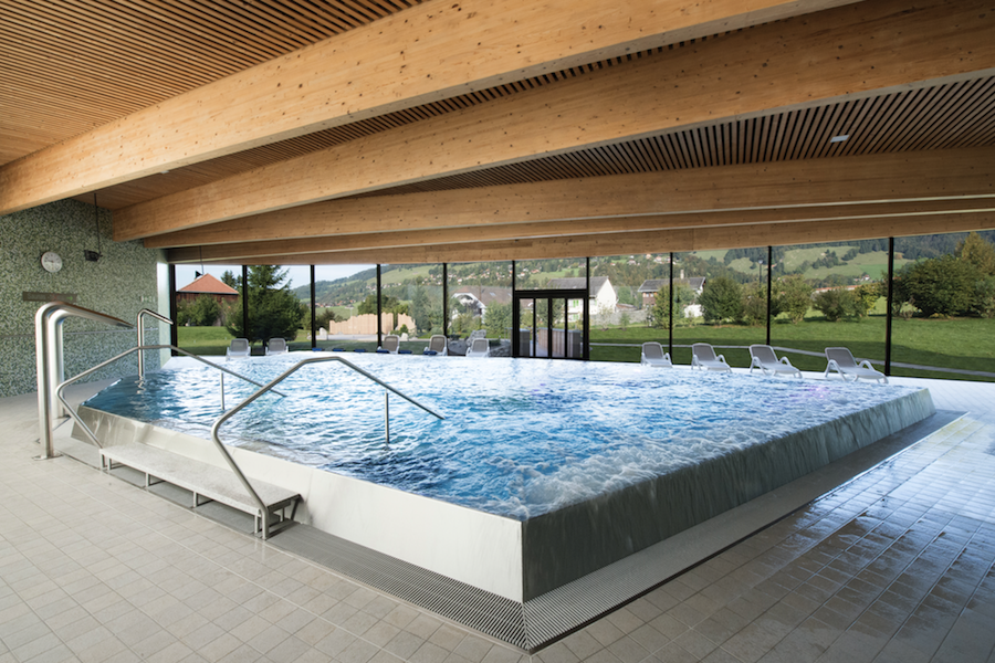 Оригинальное и инновационное по своей архитектуре здание спа-комплекса гармонично вписано в местный ландшафт. В Bains de la Gruyère — два больших бассейна с гидромассажем на открытом воздухе и под крышей, водопады, мини-джакузи, разнообразные массажные струи и даже два «горных озера» с натуральной термальной водой. Температура в них поддерживается на уровне 33-34°C, а для нагрева используются дрова. Гости могут сравнить северные и восточные банные традиции, посетив различные парные, сауны, хаммам и турецкую баню. Кроме того, здесь предусмотрено множество развлечений: от аквагимнастики до романтического вечера у бассейна при свечах.
