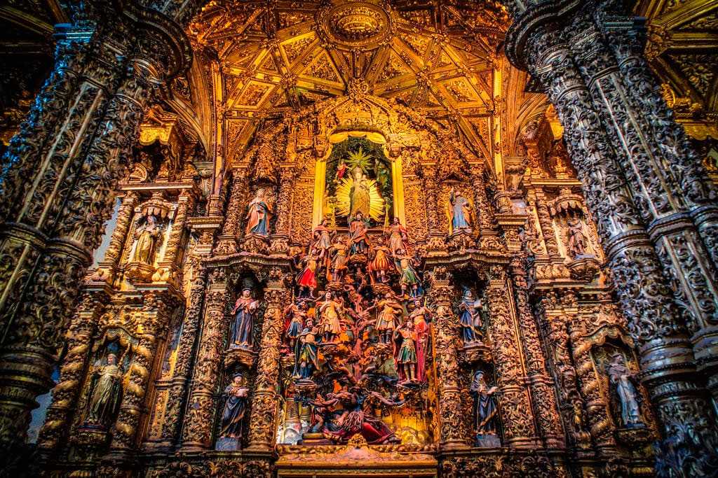 На фоне красного мрамора ярко выделяются позолоченные декоративные элементы тончайшей работы – лепнина на сводах и резьба по дереву на стенах. В Португалии подобный стиль называется Barroco Joanino – он зародился во время правления короля Жуана V, когда Португалия была на пике своего расцвета.