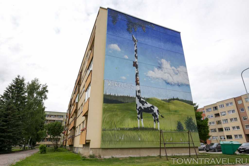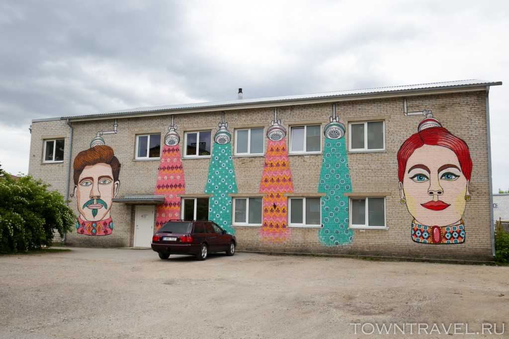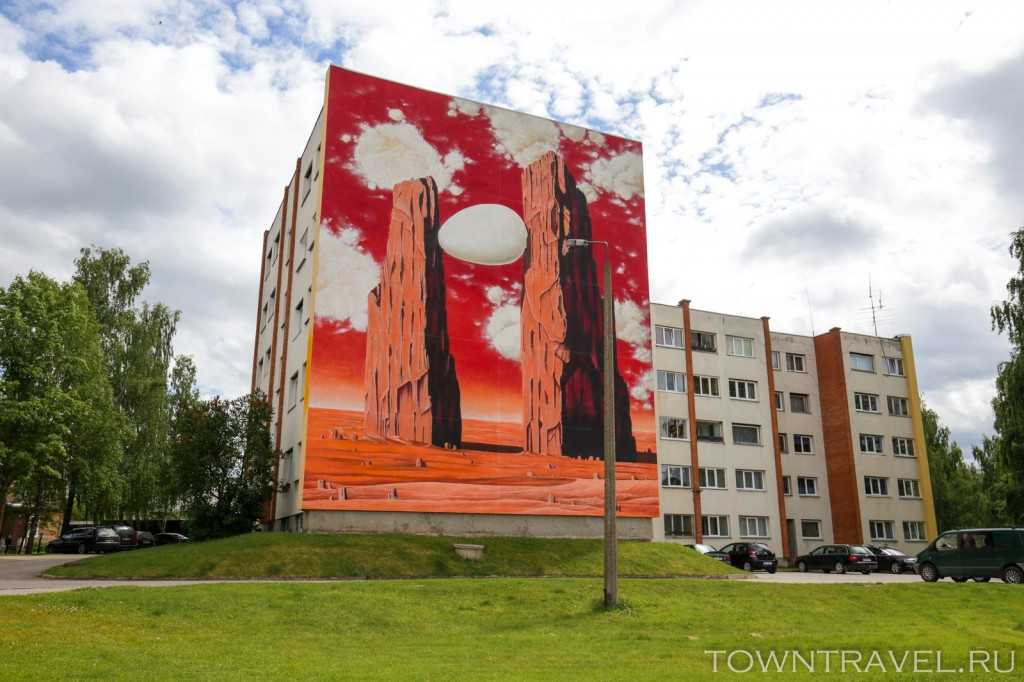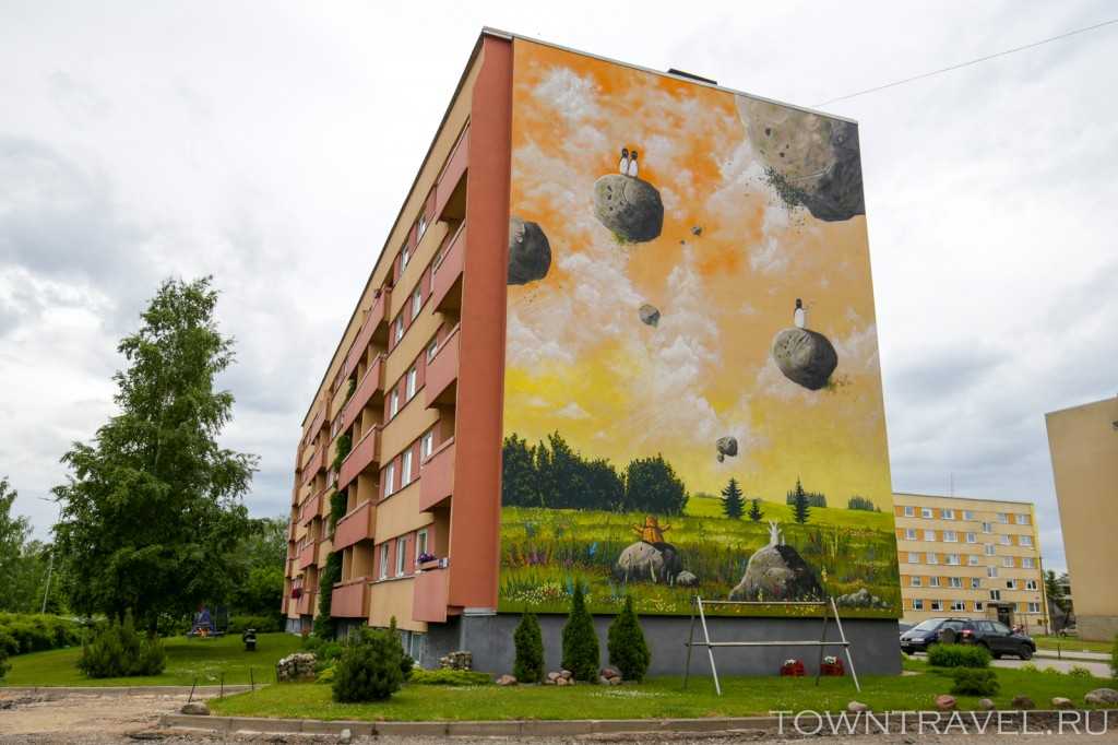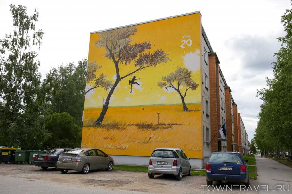 Одной из достопримечательностей Выру являются разрисованные торцы панельных домов. Так бы и хотелось сказать, что это граффити, но на самом деле на домах изображены картины эстонского художника Навитроллы.
