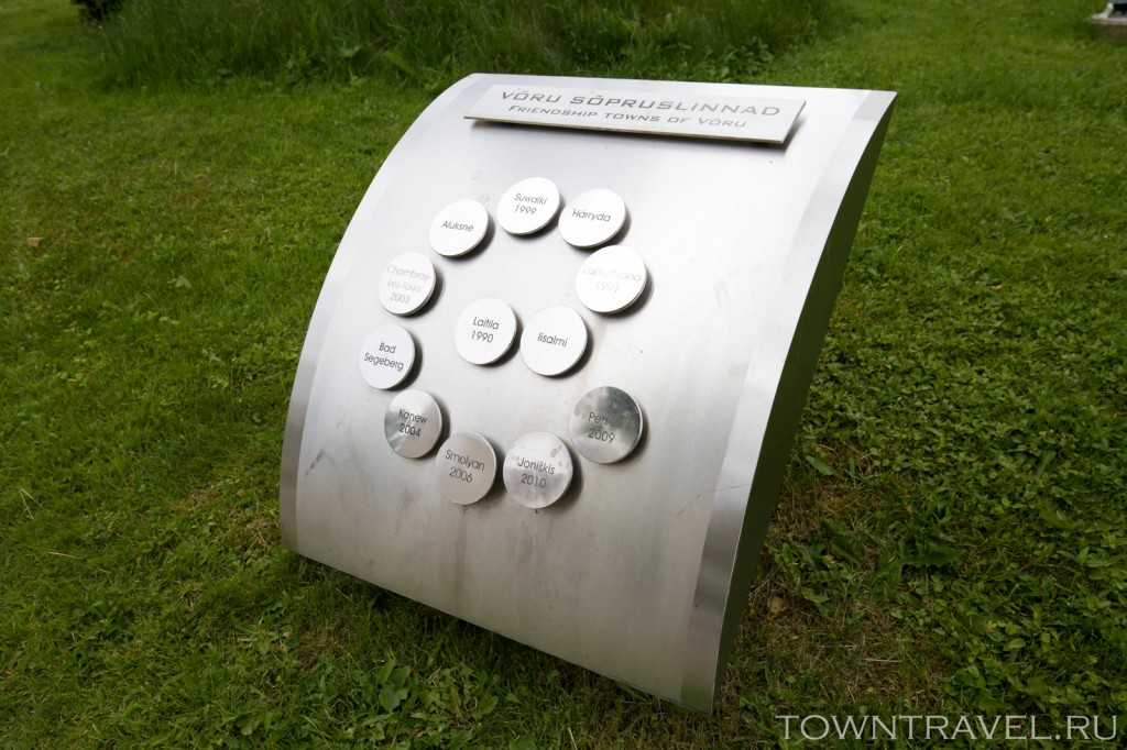 Небольшая блестящая табличка, где указаны города-побратимы Выру.