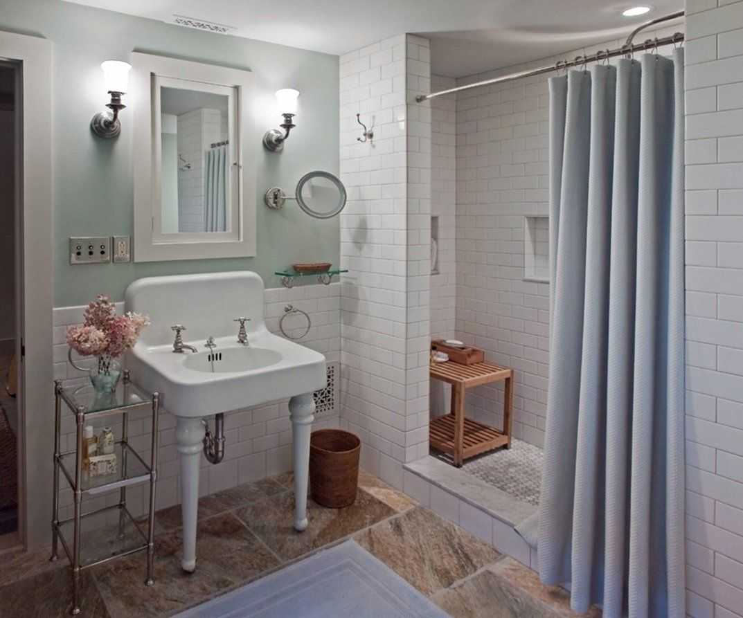 Подойдут для ниши или бортиков на полу. Может сделать интерьер ванной комнаты более уютной. Обычно за шторами прячутся окна, а там душ! Всякое бывает.