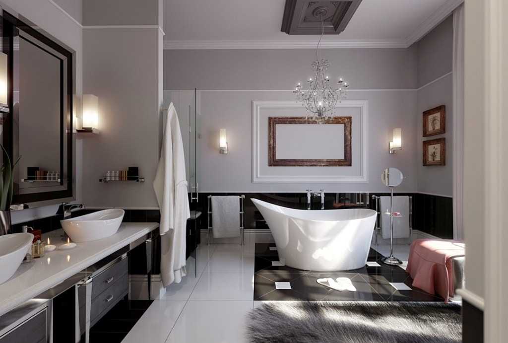 Размеры светильников будут зависеть от площади помещения ванной. Зачастую в эту комнату подбирают более компактные модели, которые монтируются в стены или потолок. Но для эстетического вида рабочей зоны делают выбор в пользу фигурных бра в соответствующем стилевом направлении, а просторные ванные комнаты можно и вовсе украсить красивой люстрой.