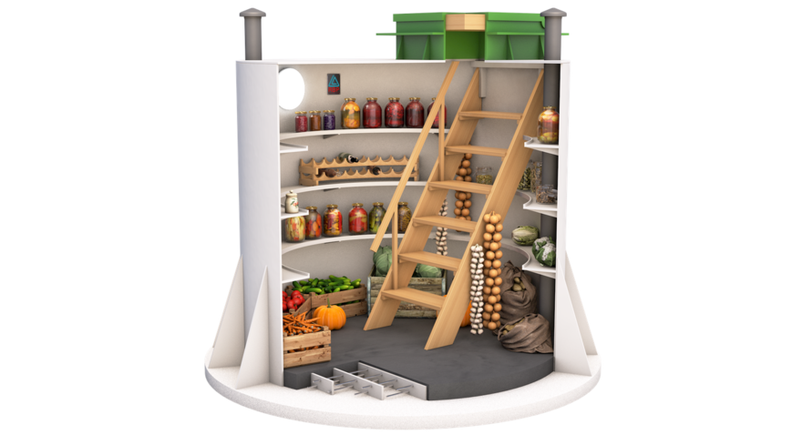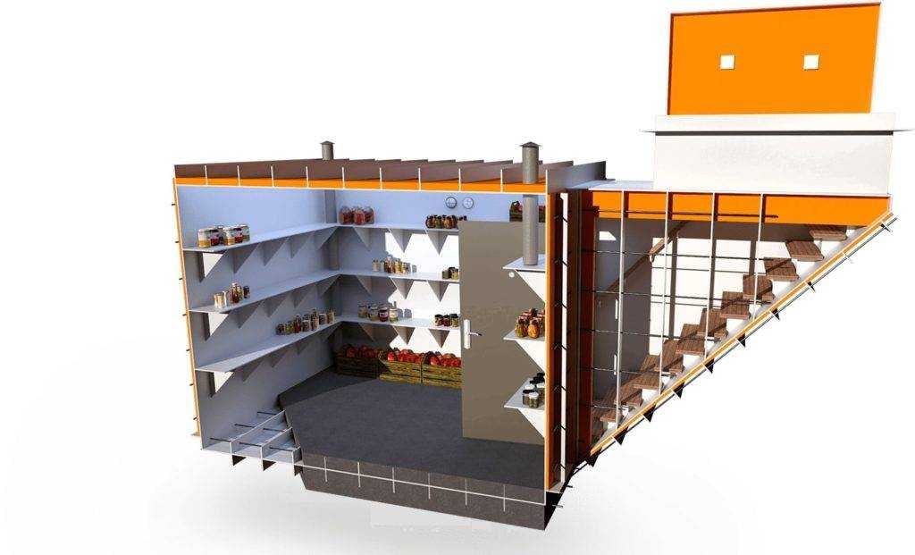 Другой вариант, используемый некоторыми производителями, — внутренний каркас из стали. Он становится опорой для полок погреба. Такие изделия необходимы для пучинистых грунтов. Наружное расширение внизу — юбка — гарантирует максимальное сопротивление конструкции выталкивающим силам.