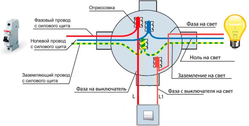 - Далее подводятся 2 жилы с нулем и землей – к контакту и корпусу светильника, соответственно.