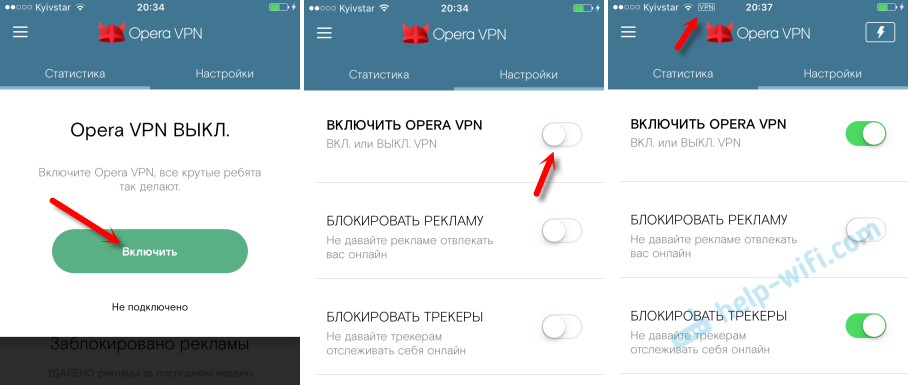Чтобы включить VPN на своем Айфоне, достаточно нажать на кнопку «Включить», или перейти на вкладку «Настройки» и активировать ее там. Возле значка Wi-Fi (сотовой связи) появится иконка VPN.