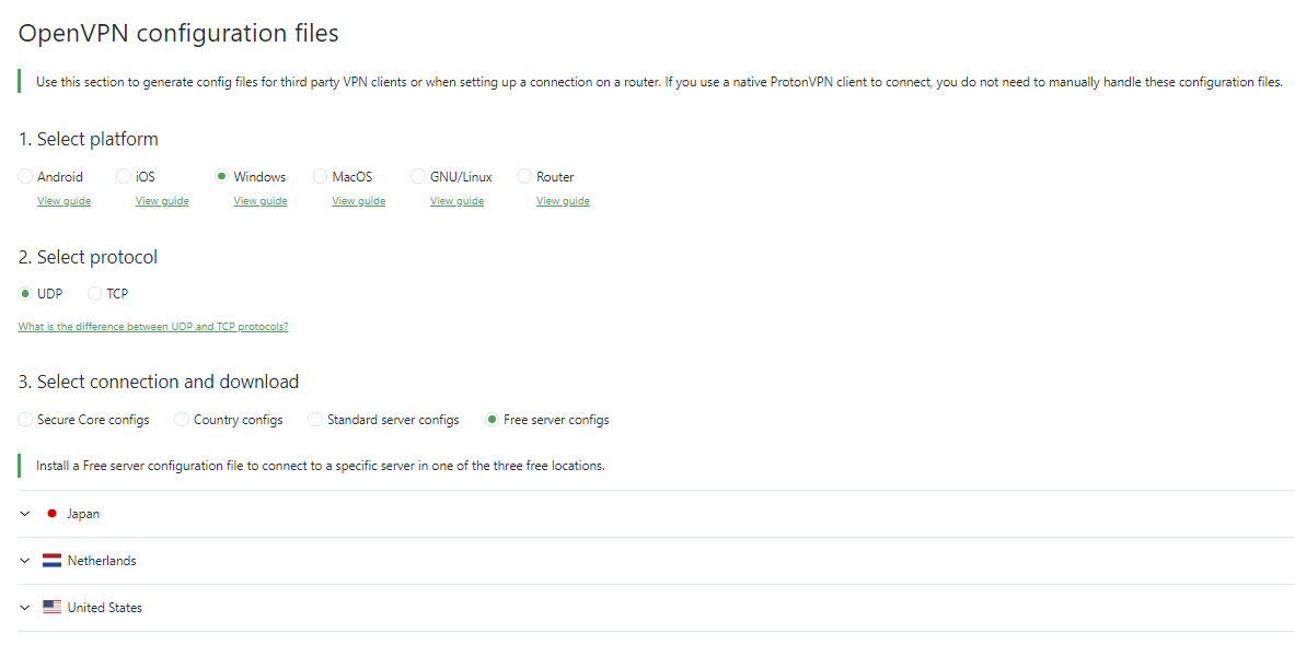 В Select platform выберите Windows, так как на неё вы будете устанавливать VPN-клиент. В разделе Select protocol доступно два типа протоколов: UDP и TCP. Оба построены на основе IP, однако выполняют работу по-разному. TCP требует, чтобы перед отправкой данных было открыто соединение, и клиент подтвердил получение. Протокол UDP – нет.