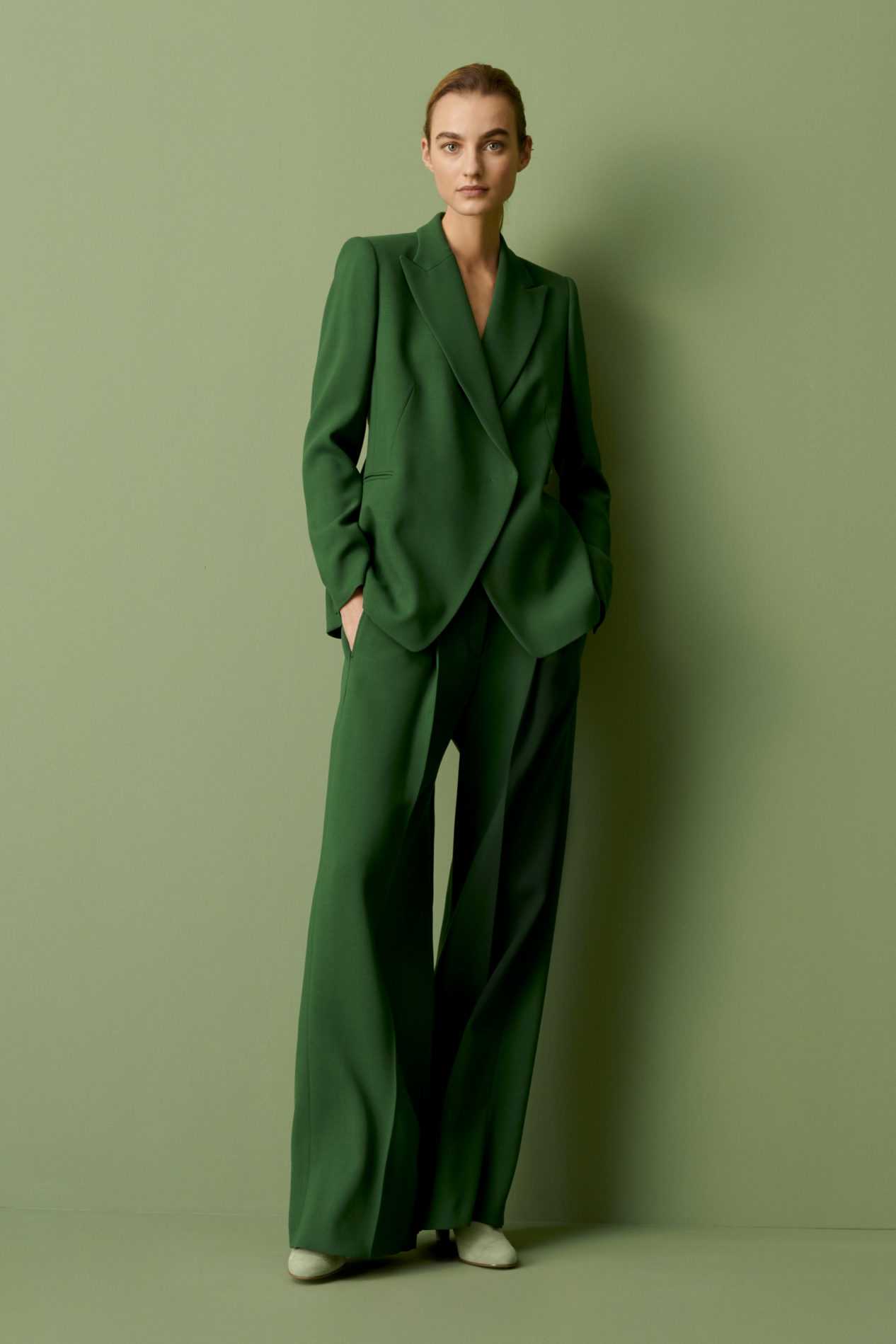 Особенно ярко здесь выделяется фасон «банан», в котором сборки на бёдрах визуально их скрадывают. Пример такого стиля – образ от Alberta Ferretti. Он выглядит романтично благодаря пышному воротничку, покрою брюк и пиджака. Образ от Coach тоже включает в себя брюки-бананы, которые расширены на бёдрах и заужены книзу.