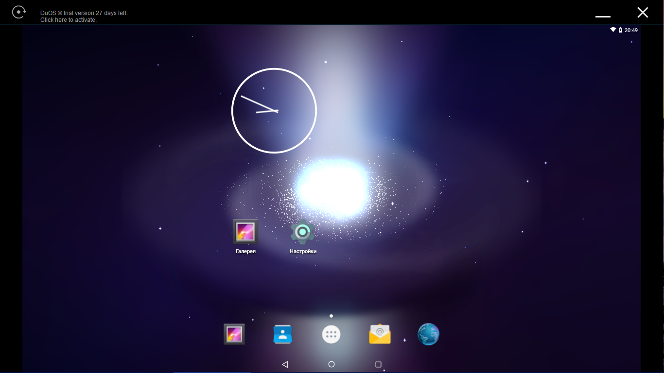Разработан фирмой American Megatrends (да-да, это ее BIOS установлены в большинстве компьютеров). DuOS использует функции гипервизора, то есть запускает Android рядом с Windows и позволяет ей работать почти без эмуляции. Стоимость составляет 9,99 доллара, но доступна демоверсия, которая работает 30 дней без ограничений. Обладает очень минималистичным интерфейсом. Даже при первом запуске следом за надписью Android открывается обычный рабочий стол. Это единственный из протестированных эмуляторов, в котором отсутствует привязка свайпов и координат точек к клавишам на клавиатуре (проблема решается установкой кеймаппера). В настройках на главной вкладке можно задать общие с Windows папки.