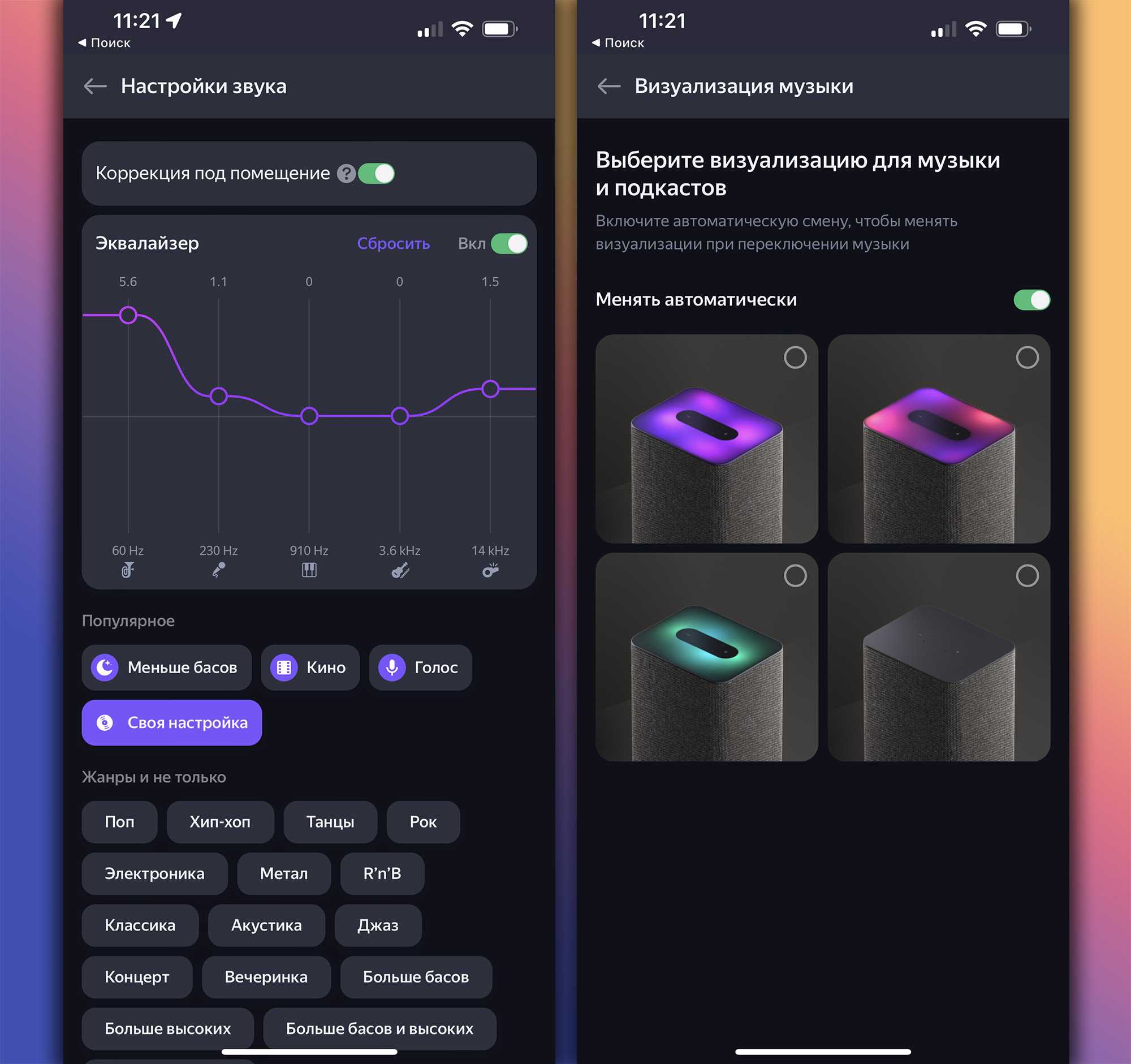 Управлять функцией коррекции звука можно в приложении Умный дом от Яндекса, в меню Эквалайзер. Она активировалась у меня спустя пару минут, после чего всегда работала. Каждые 30 секунд звучания колонка корректирует звук в зависимости от того, что сейчас играет, и где та находится.