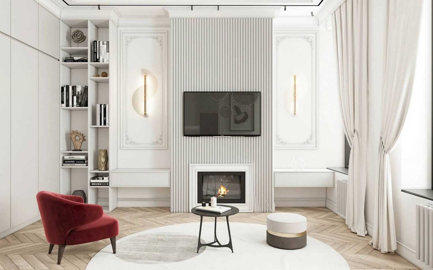 Камин с закрытой топкой безопаснее — риск возгораний минимален. Неоклассика в ЖК «Суббота», дизайнер Елена Мизотина