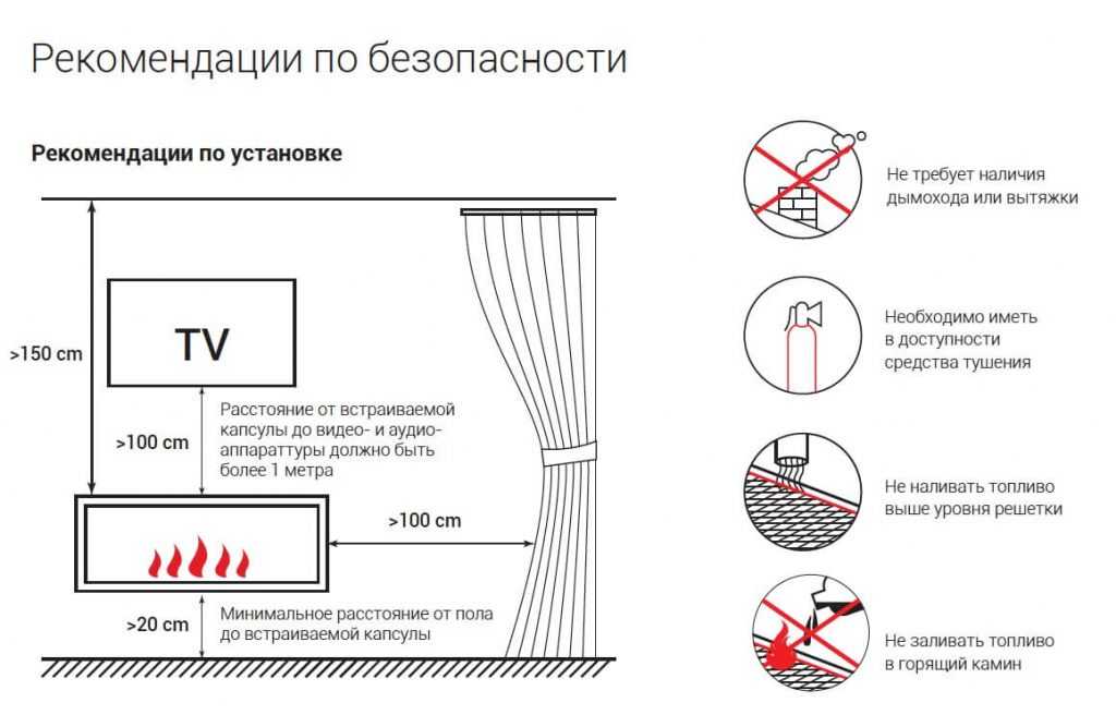 Вблизи открытого огня нельзя размещать легковоспламеняющиеся предметы и текстиль. Для моделей с электронными функциями и датчиками нужно предусмотреть доступ удобный доступ к розетке, но близкого контакта с сетью быть не должно.