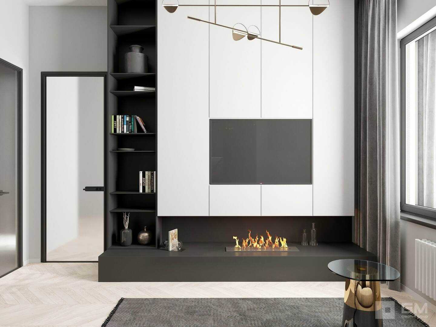 Небольшой линейный биокамин с открытой топкой. Чёрно-белый интерьер в ЖК «Символ», дизайнер Елена Мизотина