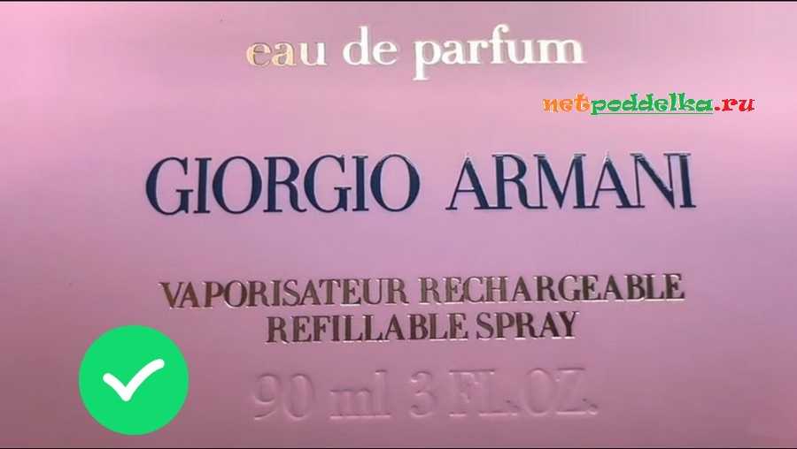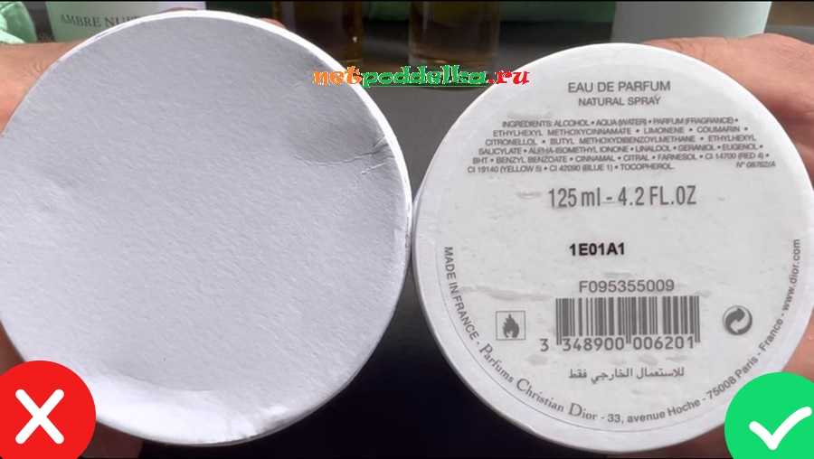 Это особенно заметно на самых мелких шрифтах. При выборе духов может помочь, если у вас на руках будет хотя бы упаковка от оригинальной продукции, чтобы сравнить качество надписей. Иногда на подделках краска не находится точно на месте рельефного оттиска.