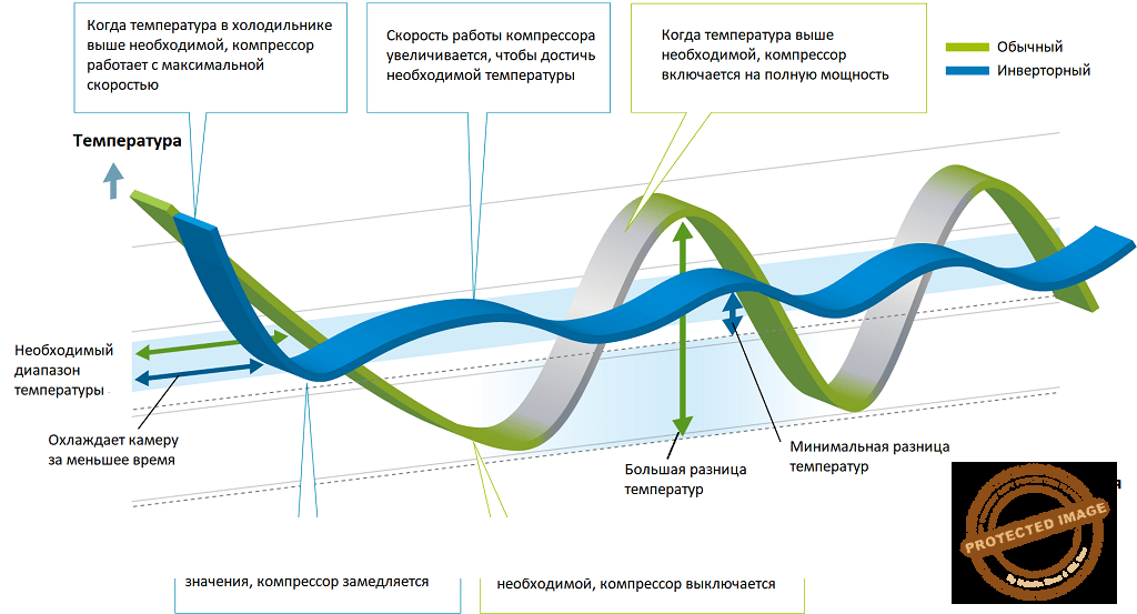 Инверторная система подразумевает плавное регулирование мощности при смене режимов работы устройства. От этого общий принцип работы холодильника не меняется. Датчик при увеличении температуры, подаёт сигнал компрессору о переходе в режим активной работы.